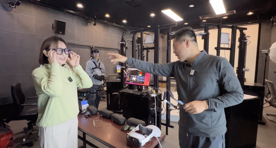 走进今天的实验室,研究的边界早已超越传统电视。团队成员、上海交大图像通信与网络工程所副所长宋利教授向记者演示了最新进展:无论电视大屏还是手机小屏,一场奥运乒乓球赛的影像可以多机位同时观看,观众不再被动等待导播切换单一画面,而是自主选择视角。另一个实验空间里,学生正在通过智能眼镜和动作捕获系统开展前沿探索。“以后戴上智能眼镜就能实时以第一视角,看到另一个场景传来的任意画面,可以是真实的,也可以是虚拟的。”宋利解释,“我们称之为从‘单视’到‘多视’,再到‘自由视’(Any View)。”