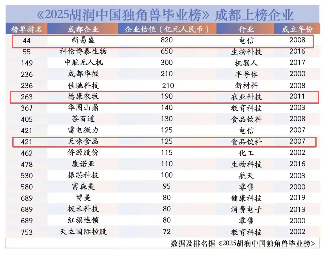 全国共有796家企业上榜,成都共有18家企业跻身《2025胡润中国独角兽毕业榜》,包括企业价值排名44位的新易盛,排名55位的科伦博泰生物,排名149位的中航无人机,并列236位的成都华微、佳驰科技,排名263位的德康农牧,排名367位的华图山鼎,排名405位的茶百道等企业。